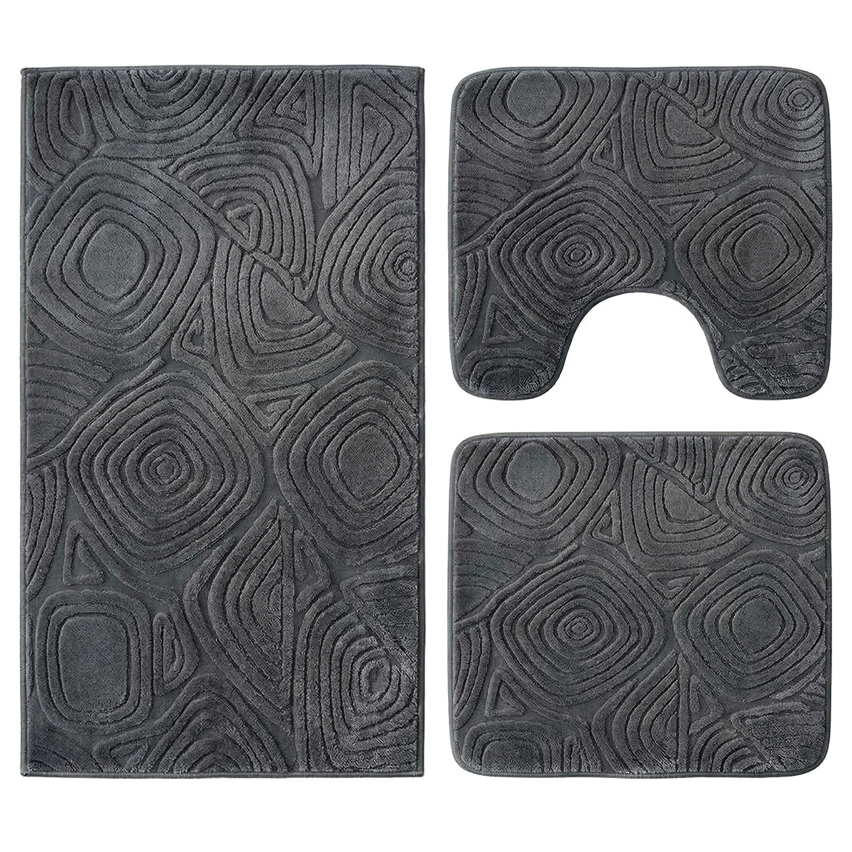 Adaugă un plus de eleganță și confort băii tale cu acest set de covoare din 3 piese, realizat din țesătură jacquard welsoft 3D, extrem de moale și plăcută la atingere. Designul în relief cu forme geometrice triunghiulare oferă un aspect modern și sofisticat, iar nuanța antracit creează un efect elegant și ușor de integrat în orice decor contemporan.