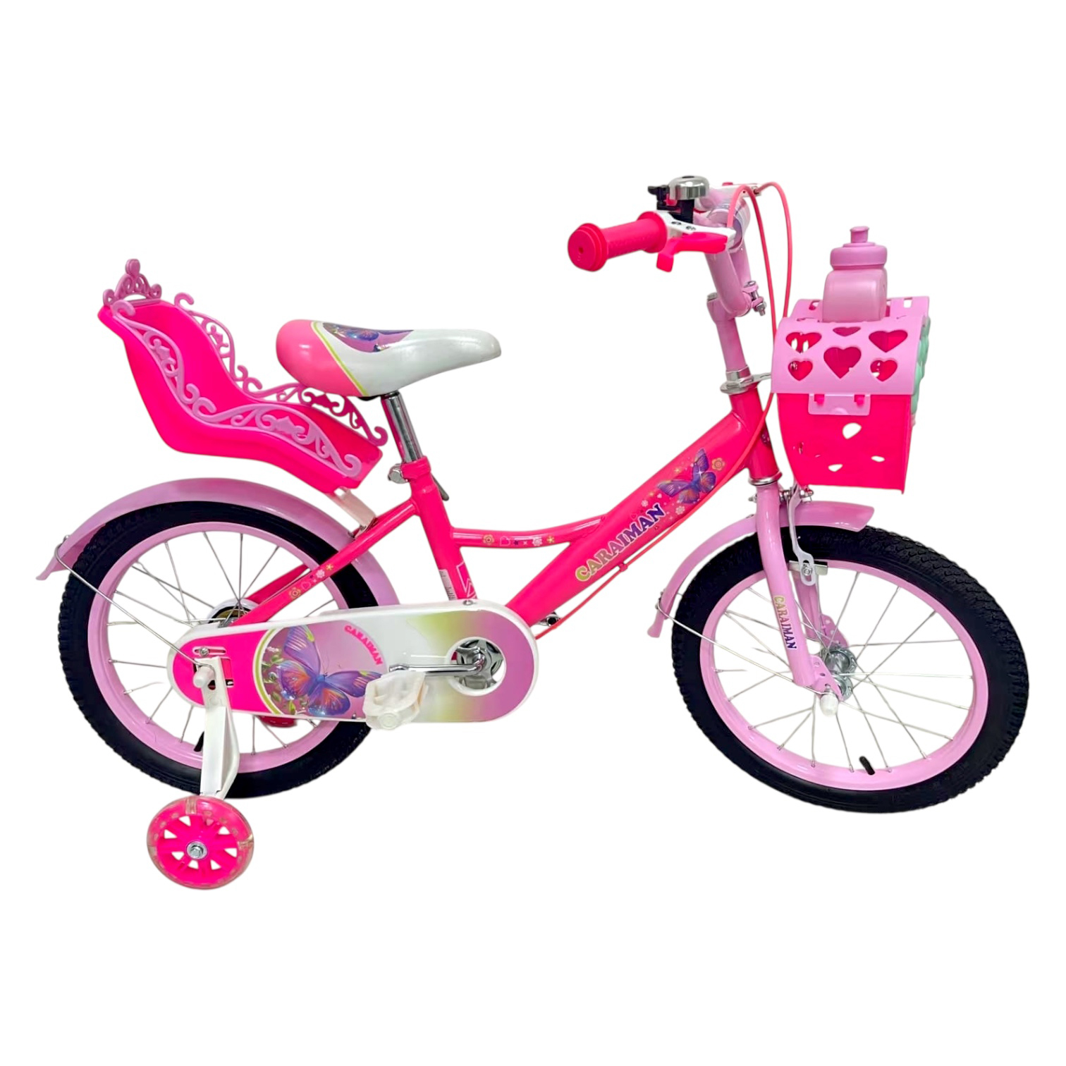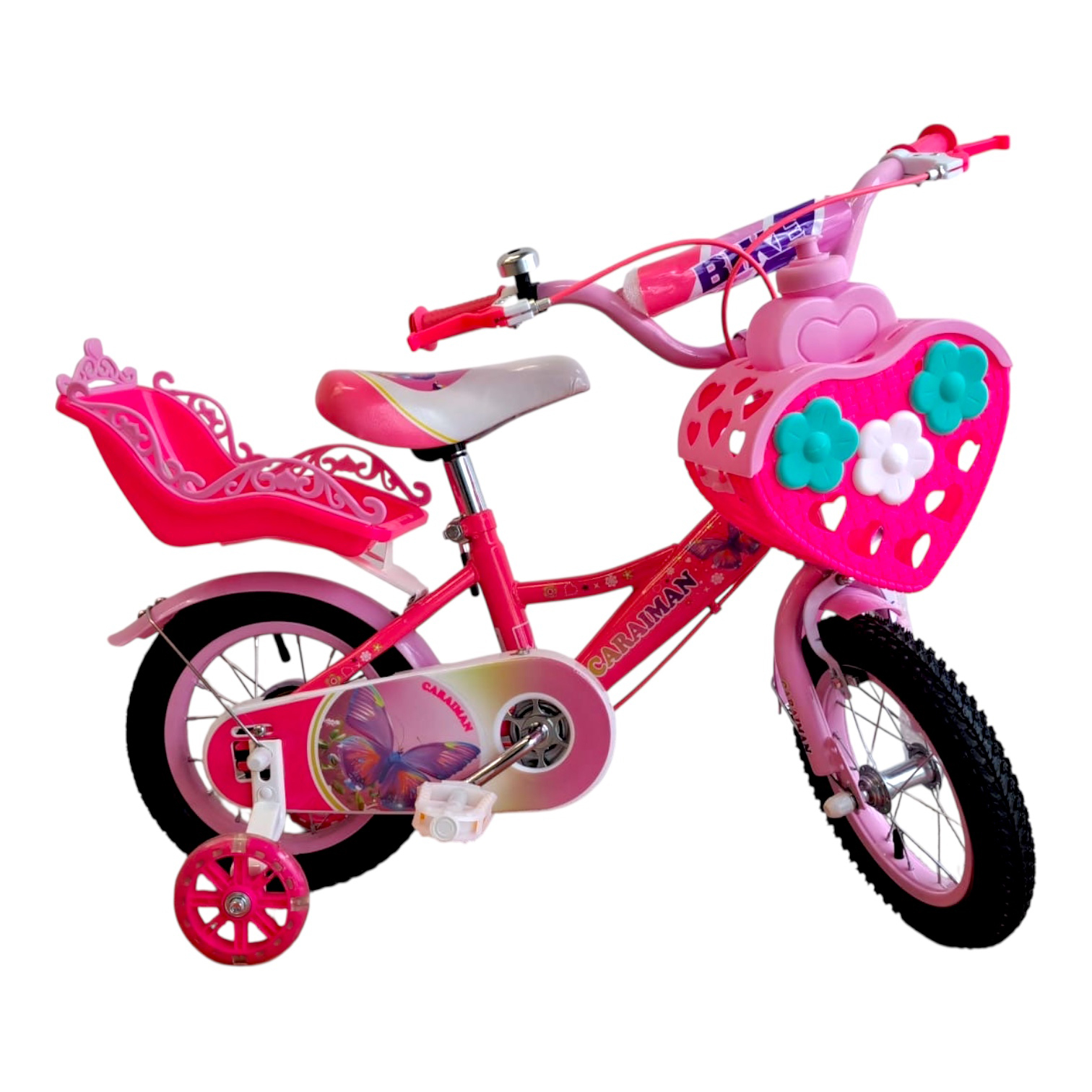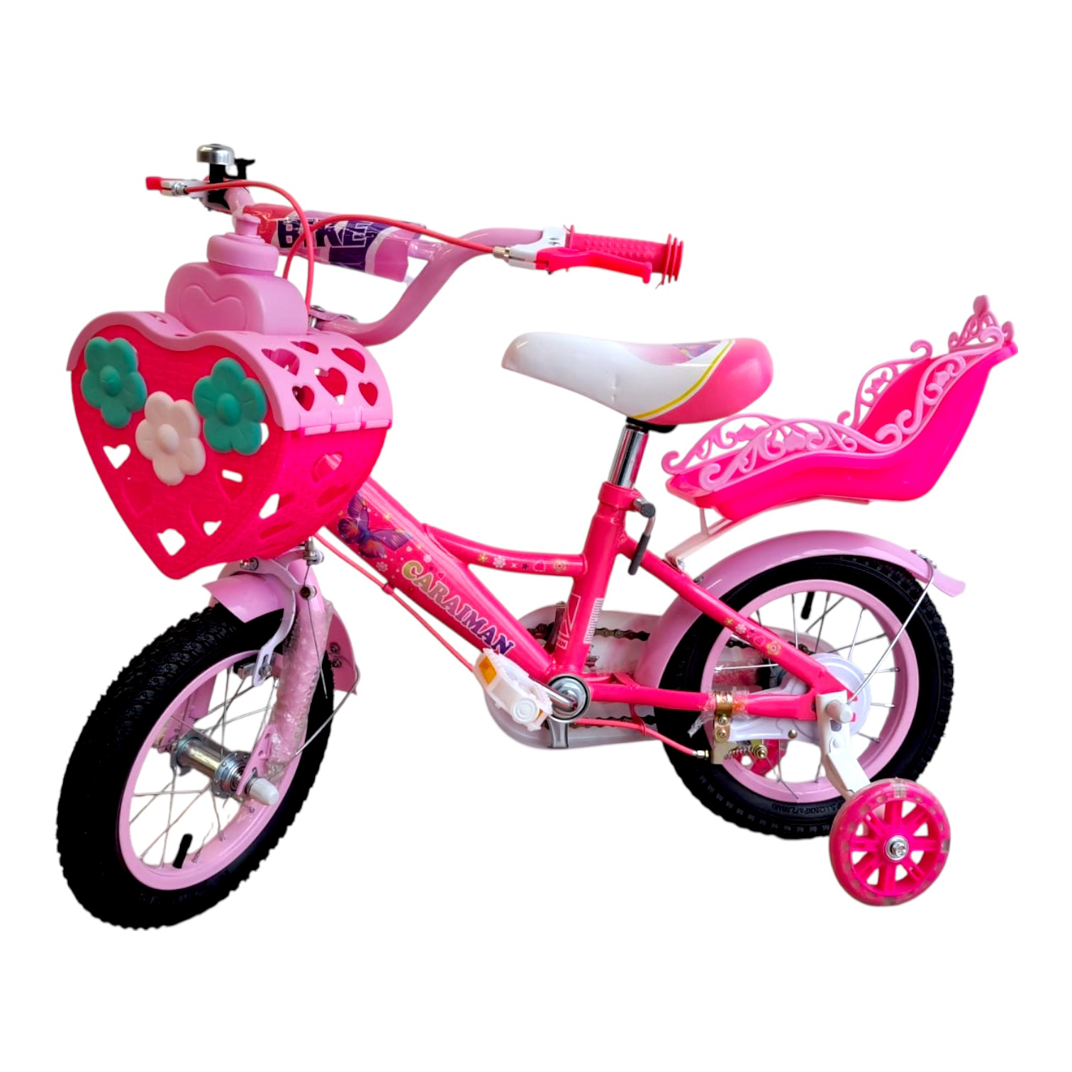 inbazaar Bicicletă copii Caraiman 12 / 14 / 16 inch, cu roți ajutătoare, coș și scăunel, roz