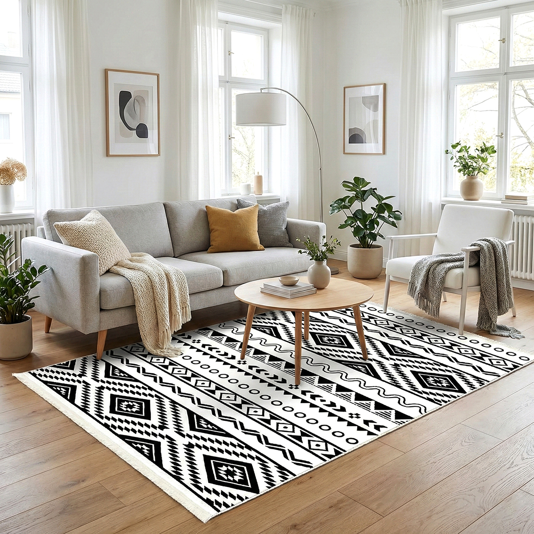 Covorul de cameră cu design etnic alb-negru este alegerea ideală pentru interioare moderne, minimaliste sau în stil boho. Modelul geometric contrastant creează un impact vizual puternic, dar echilibrat, potrivit atât pentru living, cât și pentru dormitor sau zone de relaxare. Realizat din poliester 100%, cu țesătură tip catifea imprimată la suprafață, covorul oferă o textură fină și plăcută la atingere.