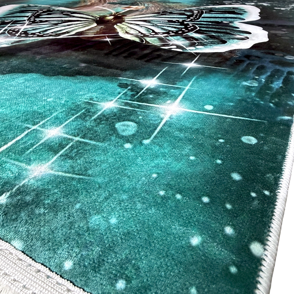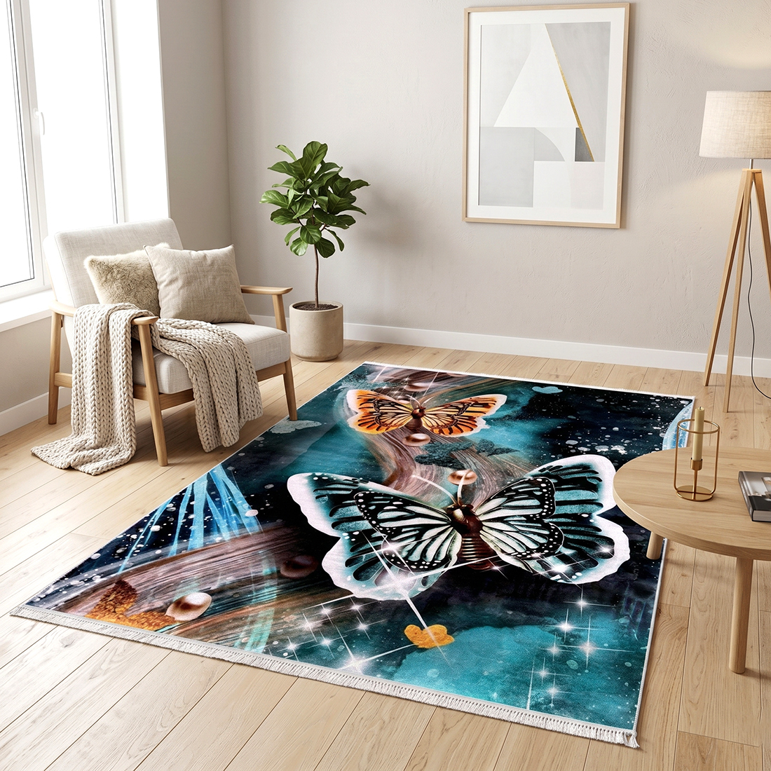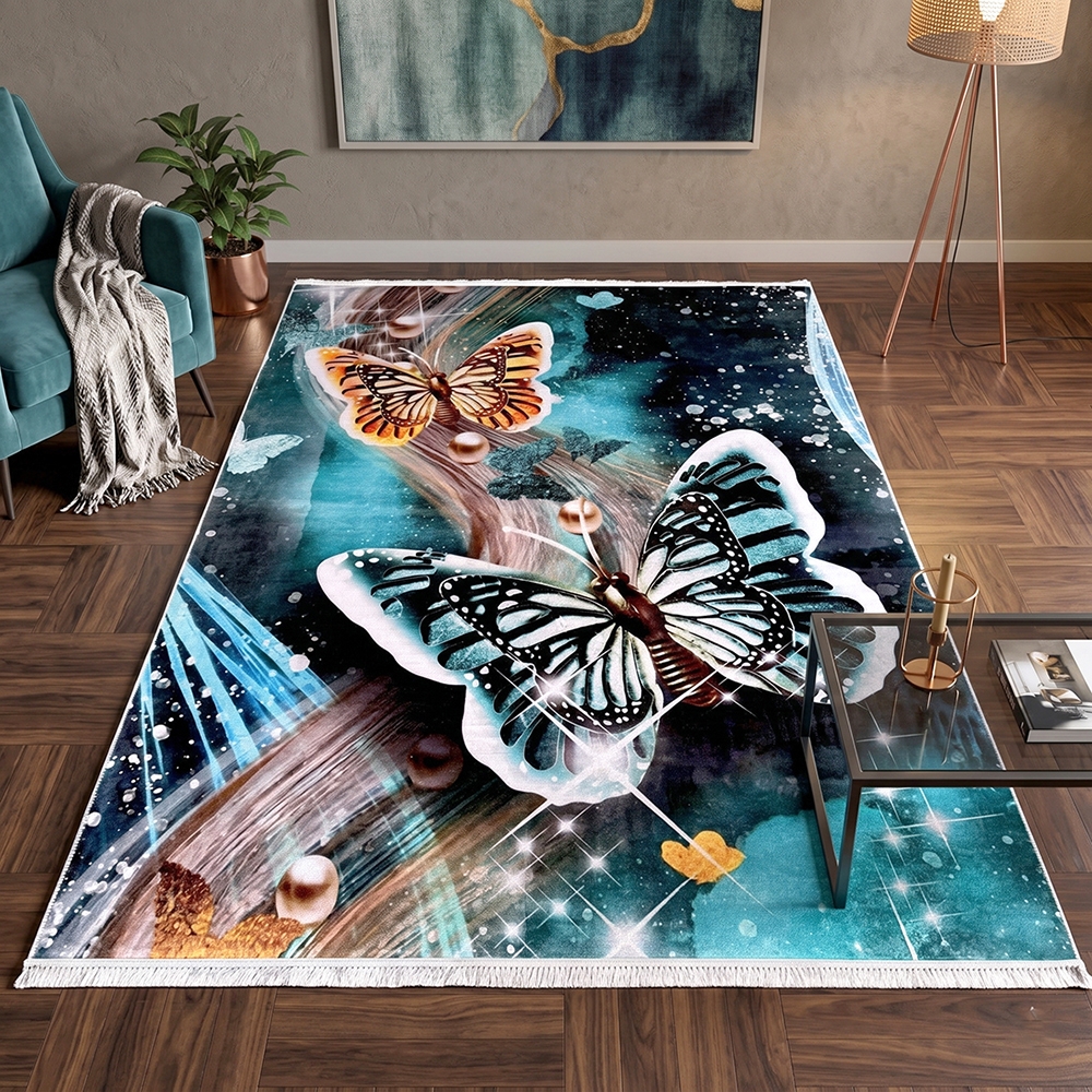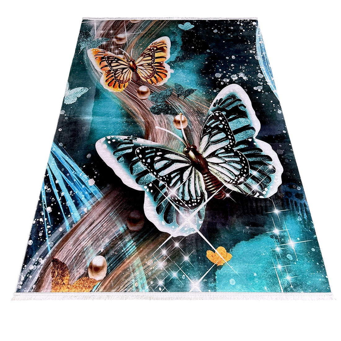 inbazaar Covor cameră antiderapant, Model Fluturi Turcoaz, mai multe dimensiuni
