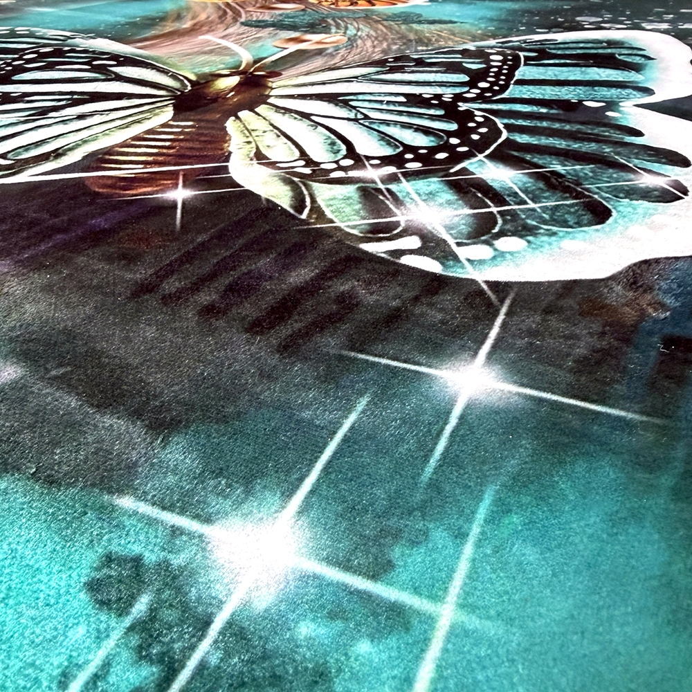 Transformă-ți spațiul într-un ambient vibrant și artistic cu acest covor modern abstract, cu model fluturi în nuanțe de turcoaz, albastru petrol, portocaliu și alb, cu accente strălucitoare și detalii tip perle. Designul cu fluturi mari și efecte de lumină creează un efect vizual spectaculos, perfect pentru interioare moderne, artistice sau contemporane.