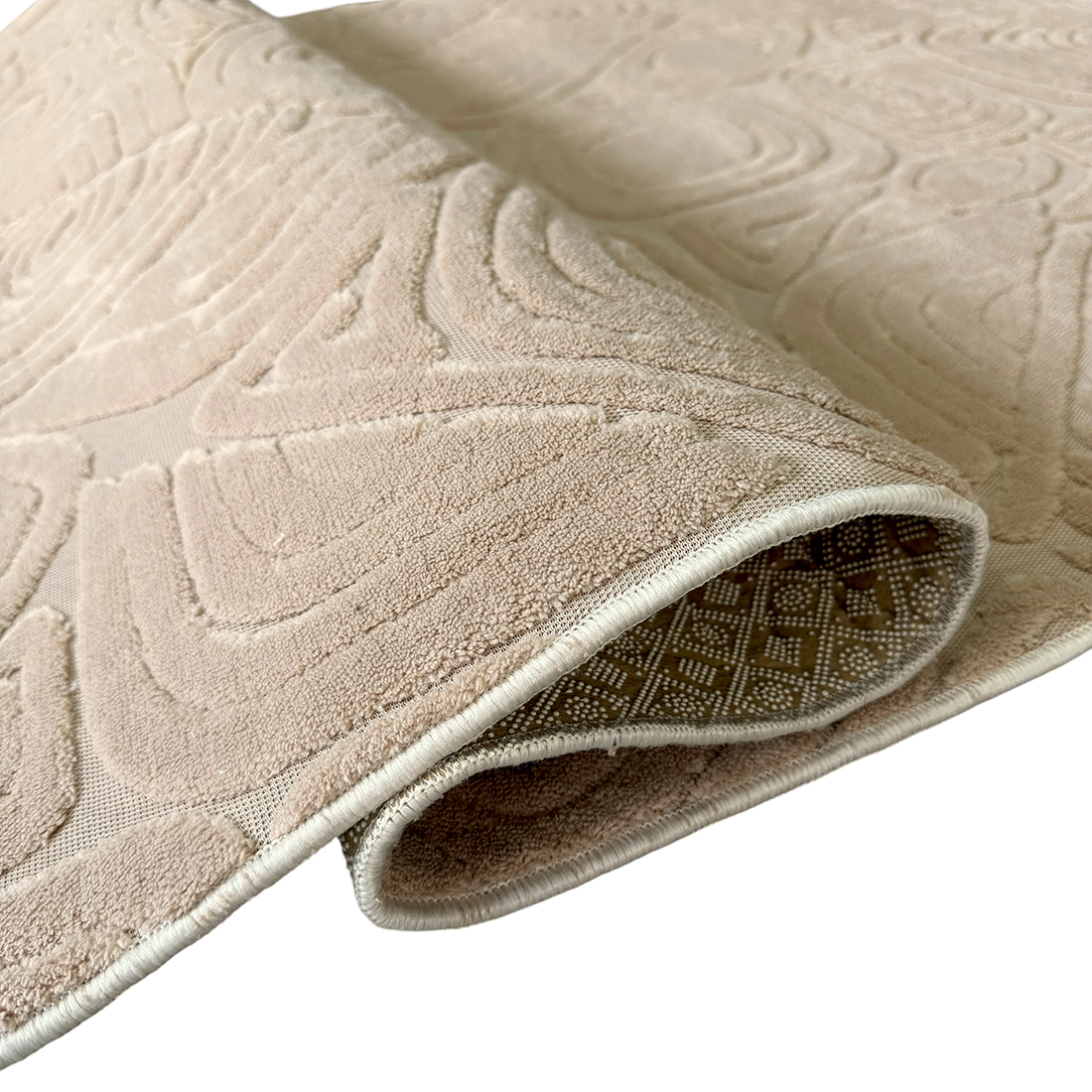 Realizat din poliester 100%, covorul beneficiază de o structură în mai multe straturi pentru confort superior: stratul superior din welsoft jacquard 3D oferă o textură pufoasă și catifelată, stratul intermediar din burete flexibil adaugă un plus de confort la fiecare pas, iar baza din fetru punctat antiderapant asigură stabilitate pe orice tip de pardoseală.