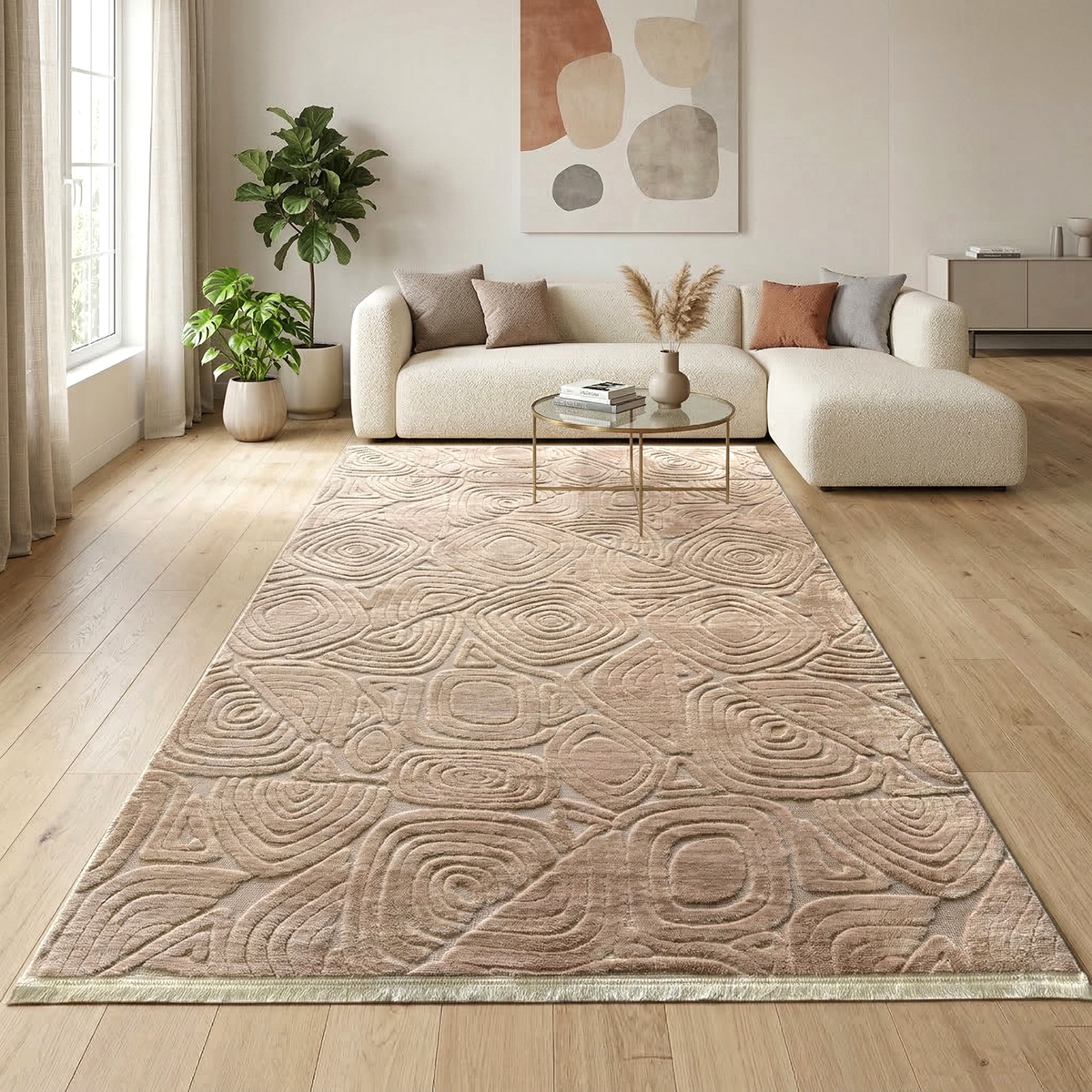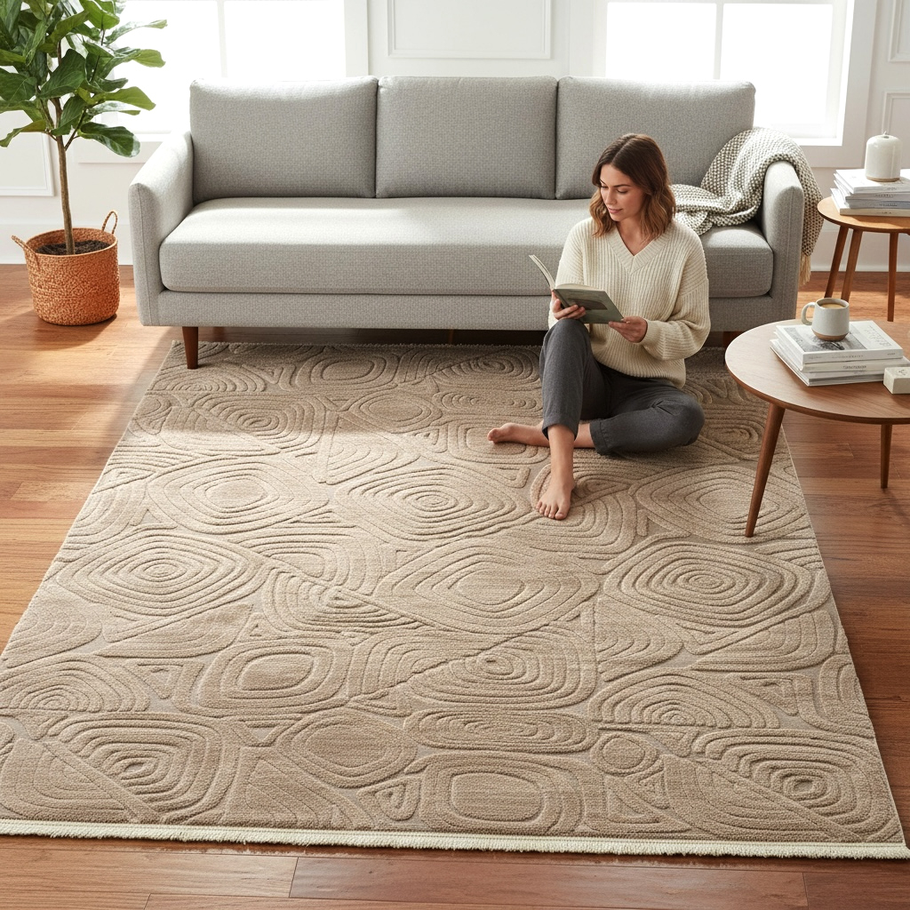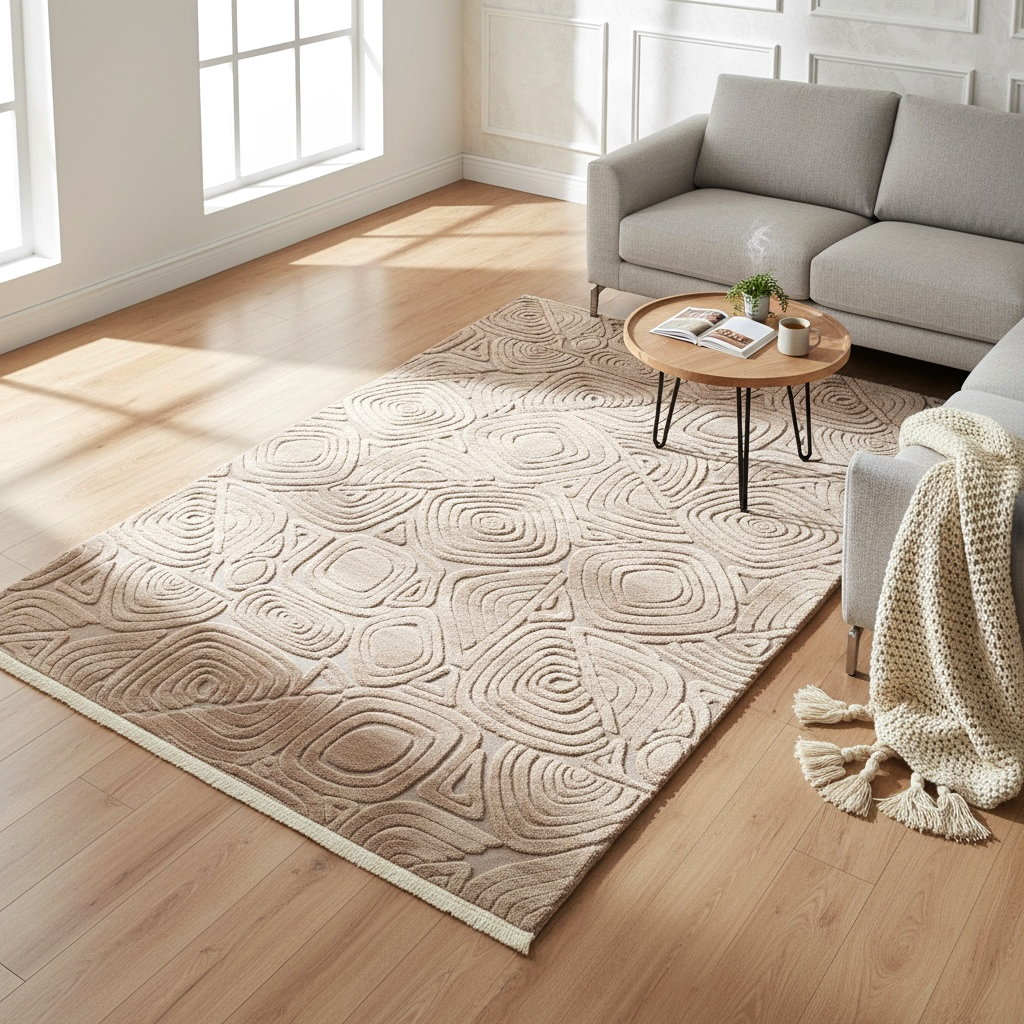 Transformă orice încăpere într-un spațiu confortabil și elegant cu acest covor modern 3D din țesătură jacquard welsoft, extrem de moale și plăcut la atingere. Designul reliefat cu forme geometrice abstracte creează un efect vizual discret și sofisticat, perfect pentru interioare moderne, minimaliste sau cozy.