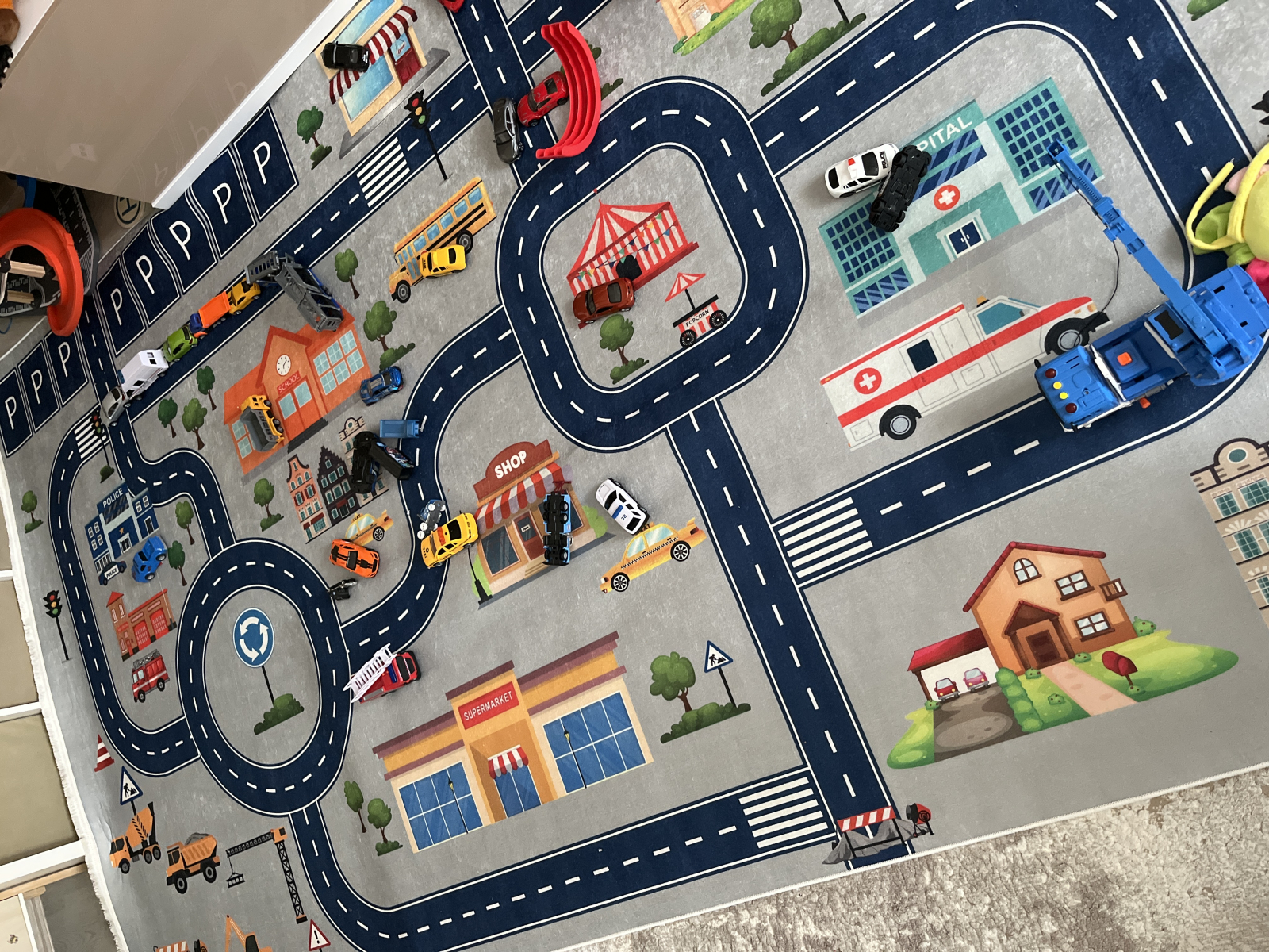 creează un spațiu de joacă interactiv, inspirat din viața urbană, cu drumuri, parcări, clădiri, școli, spital și vehicule. Designul detaliat permite joaca cu mașinuțe și figurine, stimulând imaginația, coordonarea și jocul de rol. Este ideal pentru camere de copii și spații de joacă, oferind ore întregi de distracție creativă.
