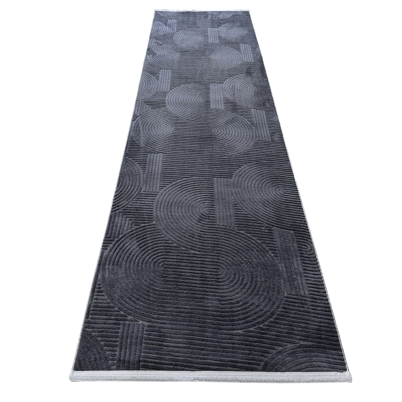 Traversa 80x300 cm este concepută pentru protejarea podelei și decorarea holurilor, camerelor sau zonelor de trecere, fiind o alegere practică și elegantă pentru locuințele moderne. Este realizată din poliester 100%, cu țesătură de jacquard welsoft 3D, având un design contemporan în nuanță antracit, cu model în relief tip acolade, ce oferă profunzime vizuală și un aspect sofisticat.