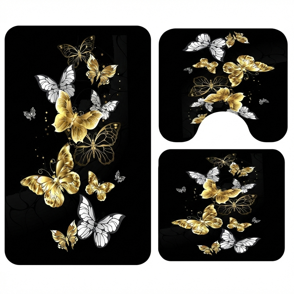 Adaugă un plus de rafinament băii tale cu acest set de 3 covoare de baie antiderapante, decorat cu fluturi aurii și argintii pe fundal negru, într-un stil elegant și sofisticat. Contrastul puternic de culori oferă un efect vizual premium, iar suprafața catifelată asigură confort la fiecare pas.