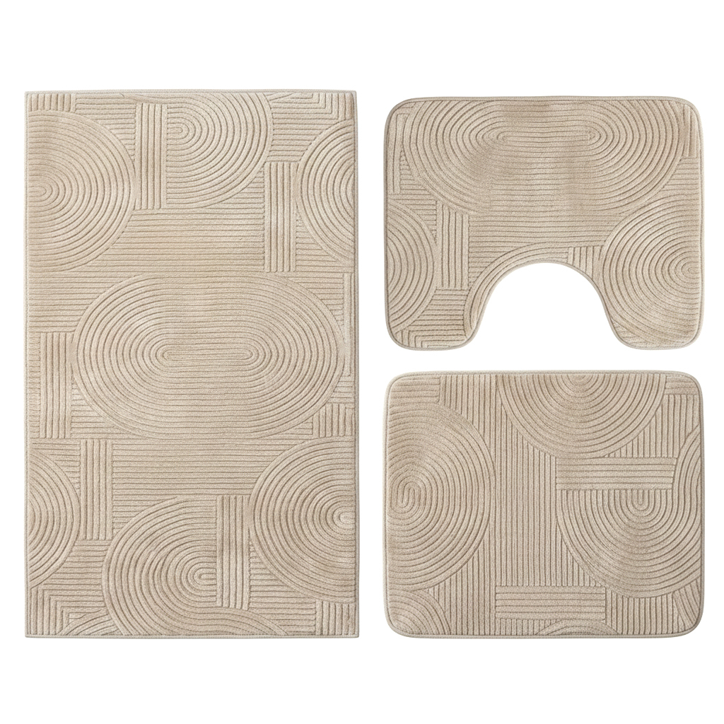 Adaugă confort, siguranță și un plus de eleganță băii tale cu acest set de 3 covoare de baie antiderapante, în culoare crem, cu model modern cu acolade. Designul cu textură jacquard welsoft 3D oferă un aspect rafinat și plăcut, potrivit atât băilor moderne, cât și celor clasice.