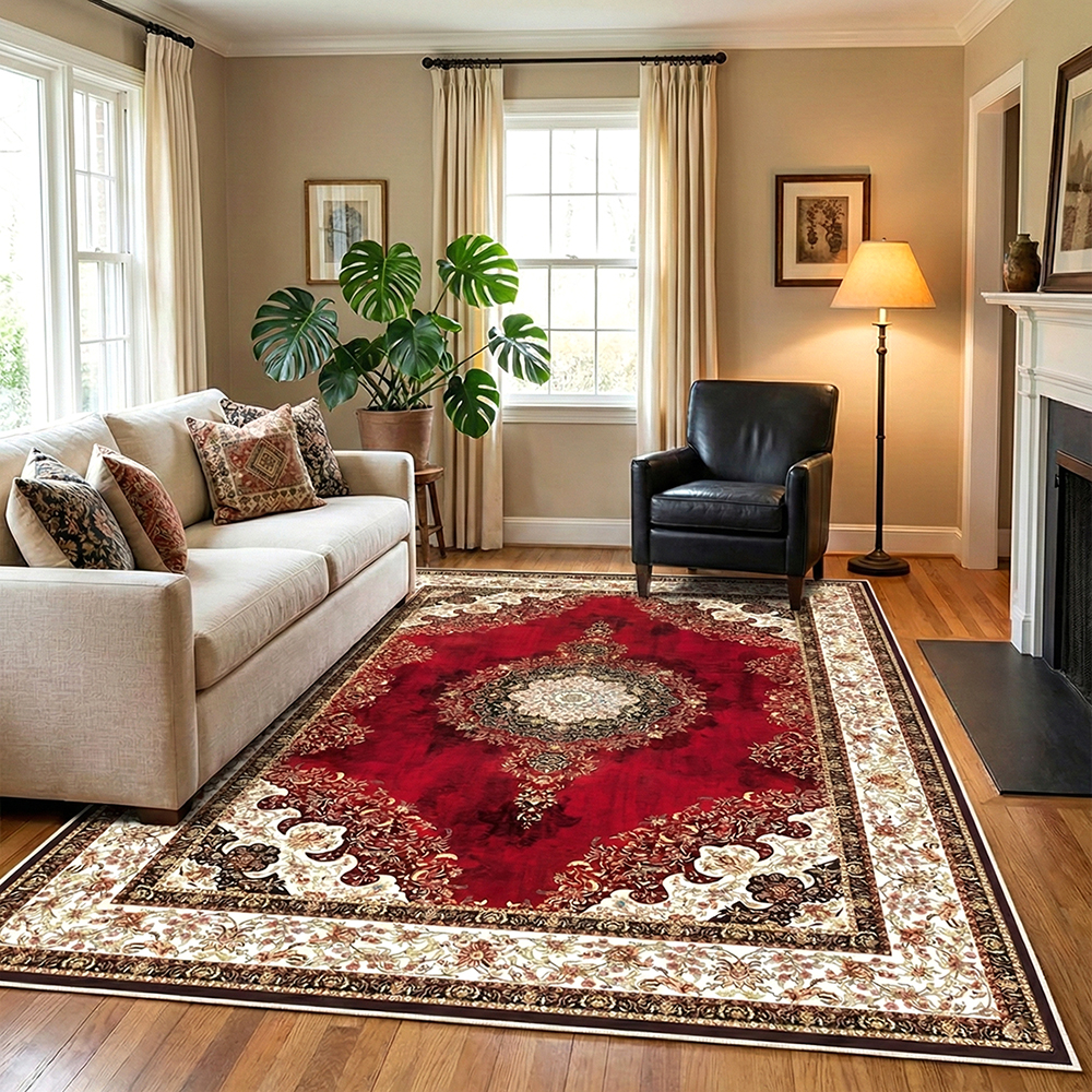 Covorul de cameră Persan Elegant, cu design tradițional clasic in stil persan, în nuanțe elegante de roșu intens, crem și accente ornamentale fine, aduce un plus de rafinament și căldură oricărui interior. Centrul covorului, într-o nuanță profundă de roșu rubin, este decorat cu motive discrete și un medalion central rafinat. Această zonă este încadrată spectaculos de o bordură lată, de culoare crem, plină de ornamente florale detaliate în tonuri de maro și auriu, creând un efect de 'tablou'. Realizat din poliester 100%, cu țesătură cu fir scurt, plăcută la atingere, acest covor oferă confort și durabilitate pentru utilizare zilnică.