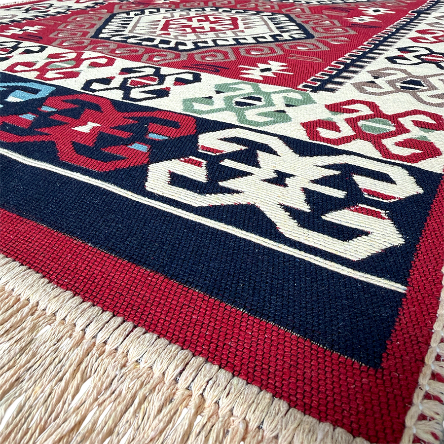 Această traversă tradițională țesută, cu dimensiunea de 80×300 cm, este ideală pentru holuri, coridoare, livinguri sau bucătării, aducând un accent decorativ puternic și un plus de personalitate și stil tradițional. Modelul se remarcă prin motive geometrice tradiționale, dispuse simetric, într-o paletă cromatică bogată, cu predominanță de roșu și accente contrastante, oferind un efect vizual elegant și dinamic.