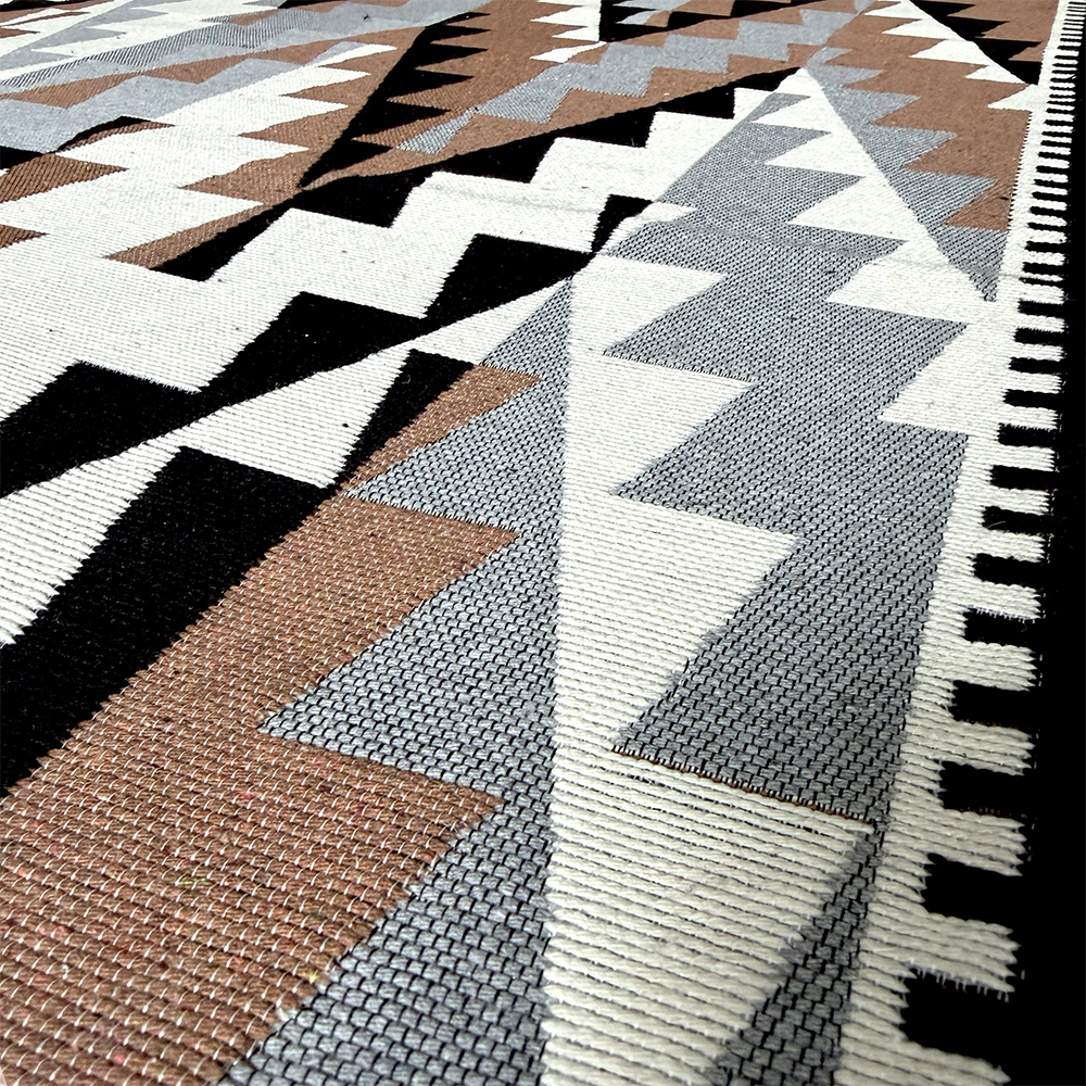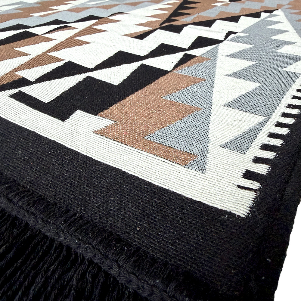 Această traversă tradițională țesută, cu dimensiunea de 80×300 cm, se remarcă printr-un design geometric modern, cu influențe etnice reinterpretate, ideal pentru holuri, coridoare, livinguri sau bucătării. Modelul tip zig-zag, realizat în tonuri neutre de negru, gri, alb și maro, adaugă profunzime și ritm vizual, integrându-se ușor atât în interioare moderne, cât și în amenajări rustice sau minimaliste.