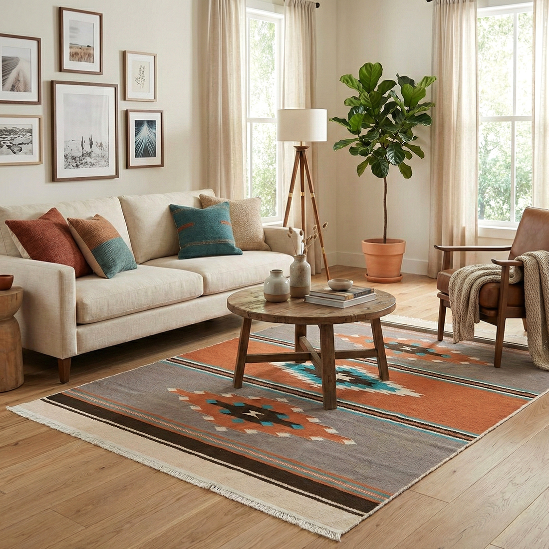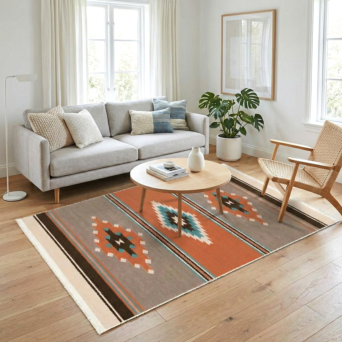 Covorul de cameră cu design etnic în nuanțe calde de maro, teracotă și accente turcoaz adaugă personalitate și confort oricărui spațiu. Modelul geometric inspirat din motive tribale creează un efect vizual echilibrat și decorativ, potrivit atât pentru interioare moderne, cât și pentru amenajări în stil boho sau rustic. Realizat din poliester 100%, cu țesătură tip catifea imprimată la suprafață, covorul oferă o textură fină și plăcută la atingere.