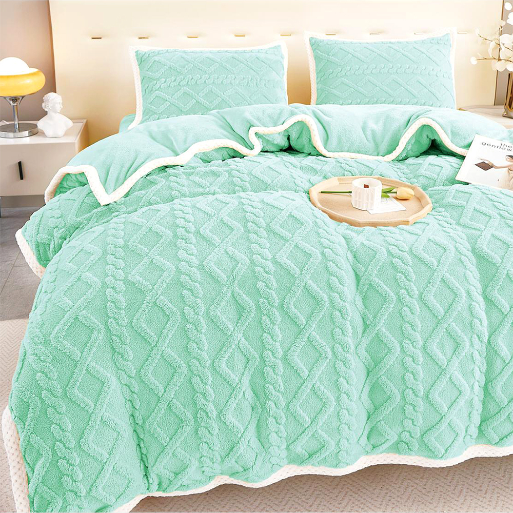 Setul de lenjerie este confecționat din microfibră plușată, cu o textură pufoasă, foarte călduroasă și plăcută la atingere și care nu intră la apă. Se poate spăla la 30 de grade Celsius și nu necesită călcare după spălare.