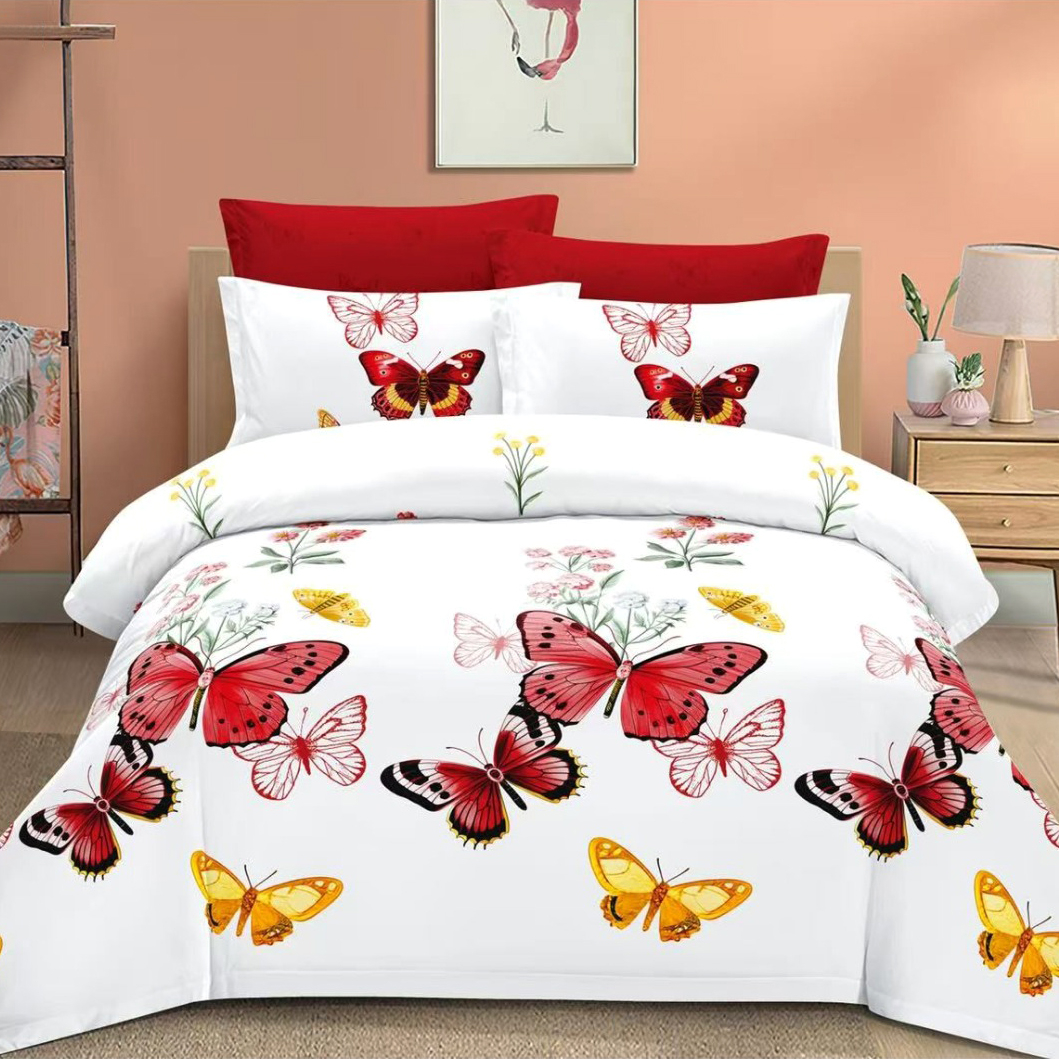 Adaugă un plus de rafinament și romantism dormitorului tău cu lenjeria de pat SP1061 din bumbac finet, un set complet de 6 piese, conceput pentru paturi matrimoniale. Designul elegant cu fluturi mari în nuanțe de roșu și galben, completat de detalii florale delicate pe fundal alb, creează un decor luminos, expresiv și armonios.