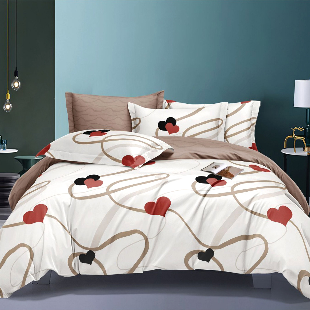 Creează un decor modern și romantic în dormitor cu lenjeria de pat SP1073 din bumbac finet, un set complet de 6 piese, conceput pentru paturi matrimoniale. Designul elegant cu inimi stilizate și linii curbe, în nuanțe armonioase de crem, bej, maro și accente de roșu și negru, oferă un aspect rafinat și echilibrat.