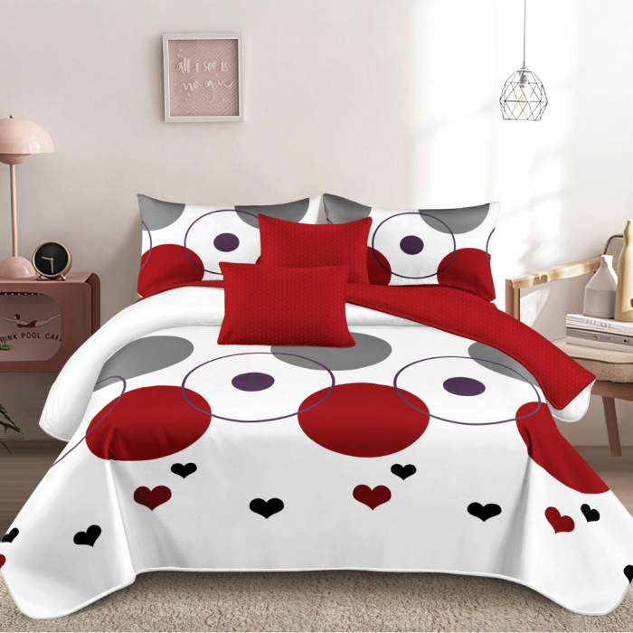 Adaugă un plus de energie și stil dormitorului tău cu lenjeria de pat SP564 din bumbac finet, un set complet de 6 piese, ideal pentru paturi matrimoniale. Designul modern cu cercuri și accente grafice în nuanțe de roșu, gri și alb creează un decor dinamic, elegant și contemporan.