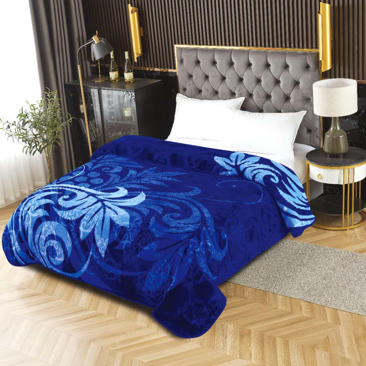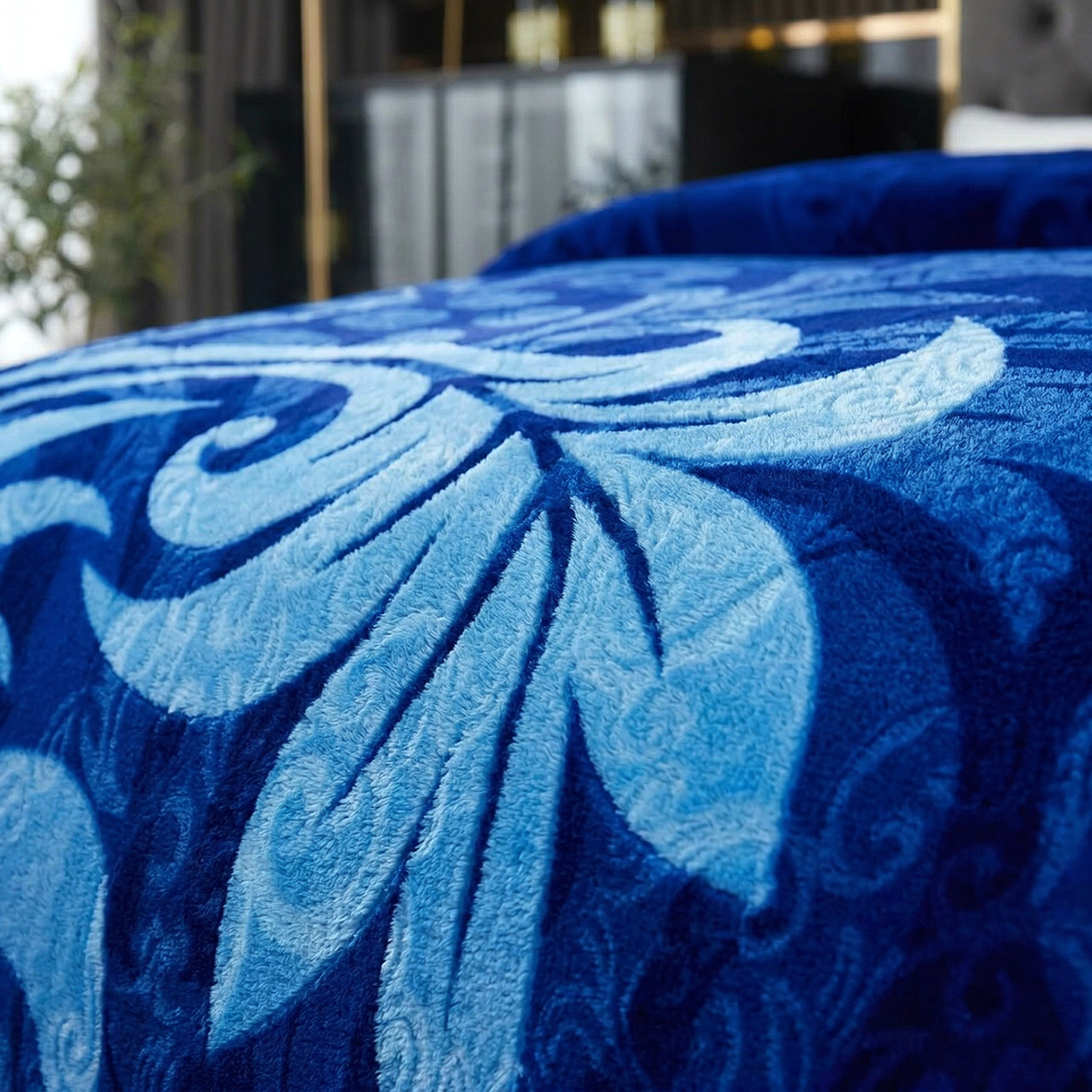 Pătură cocolino gofrată din microfibră plușată, cu design 3D în relief și model ornamental tip frunze și arabescuri în nuanțe de albastru royal și albastru deschis. Confecționată cu două fețe, oferă o textură moale și plăcută la atingere, ideală pentru serile răcoroase sau ca element decorativ în dormitor.
