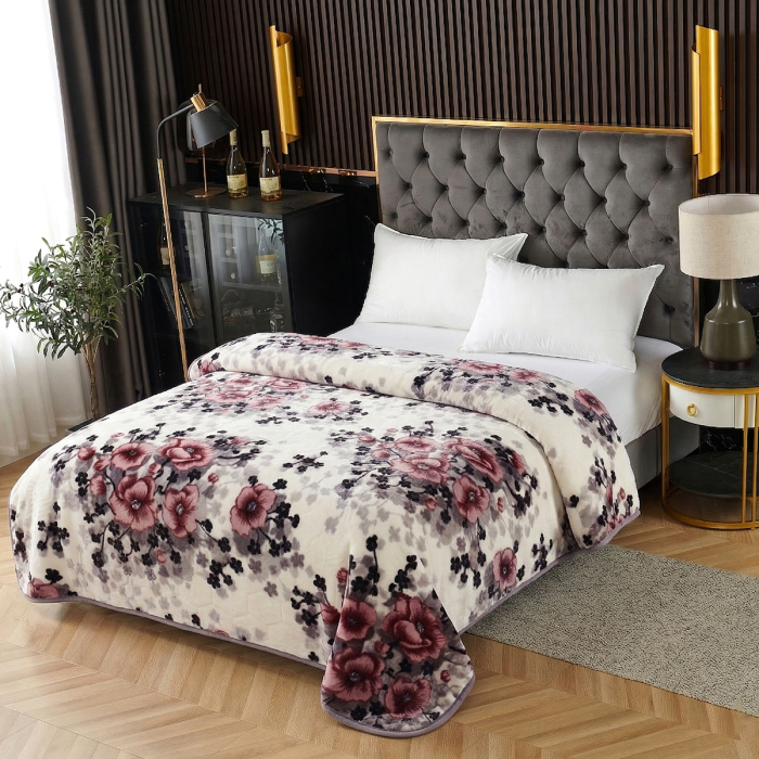 Pătură cocolino gofrată din microfibră plușată, cu design 3D în relief și model floral elegant, cu flori mari roz-vișiniu și accente gri și negre. Confecționată cu două fețe, oferă o textură moale și plăcută la atingere, ideală pentru serile răcoroase sau ca element decorativ în dormitor.