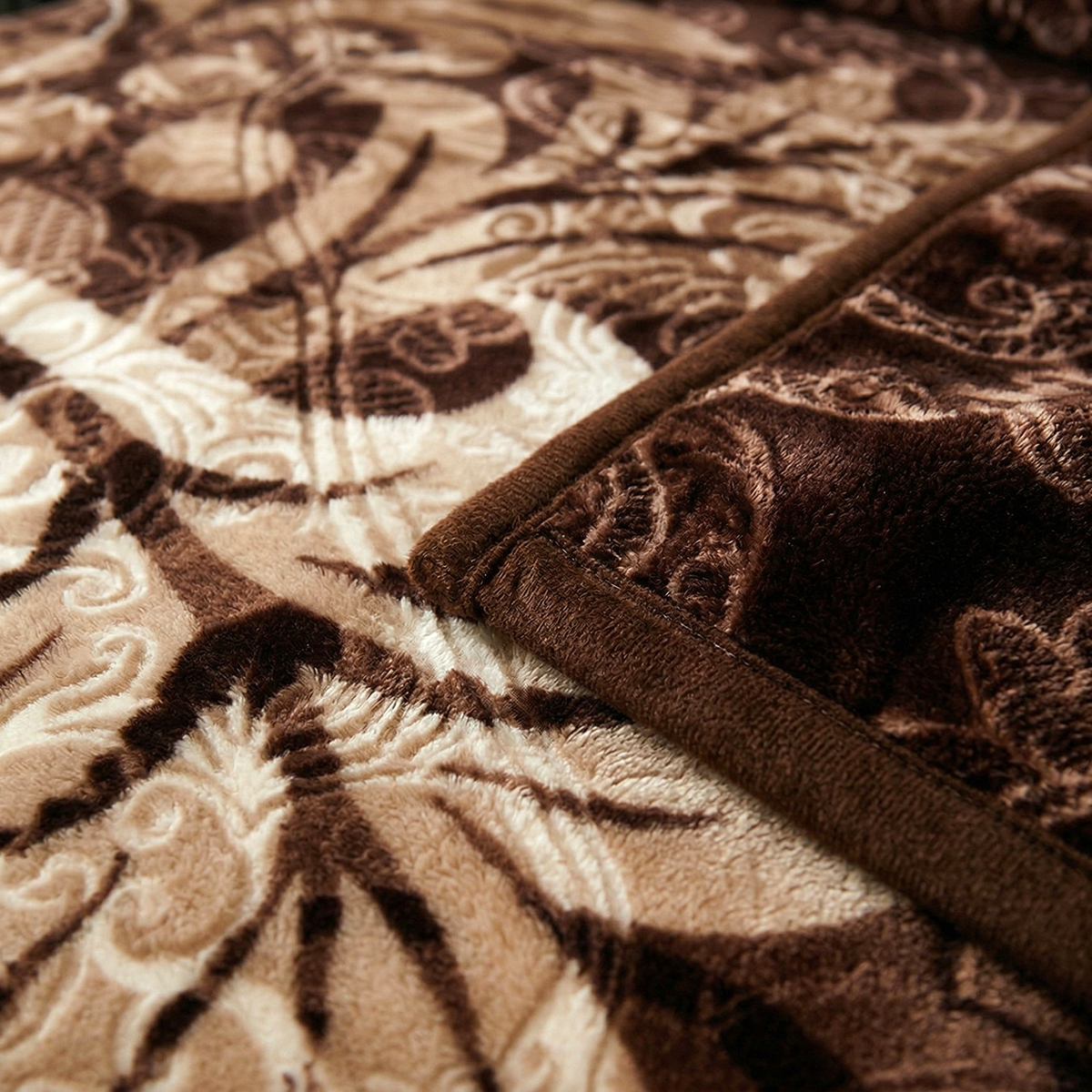 Pătură cocolino gofrată din microfibră plușată, cu design 3D în relief și model ornamental cu arabescuri și frunze stilizate pe fond maro închis, în nuanțe de bej, crem și maro deschis. Confecționată cu două fețe, oferă o textură moale și plăcută la atingere, ideală pentru serile răcoroase sau ca element decorativ în dormitor.