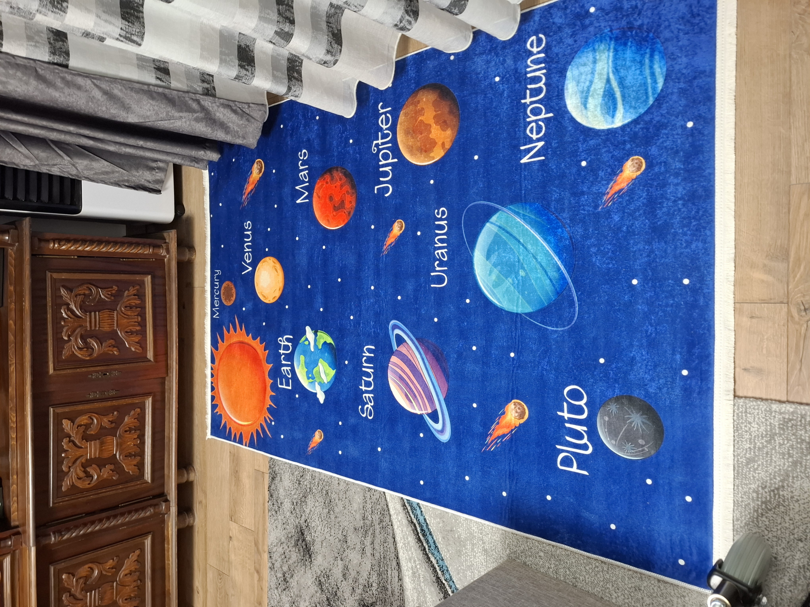 Covorul pentru copii Solar System transformă camera celor mici într-un spațiu educativ și plin de imaginație, prin designul colorat cu planetele sistemului solar, stele și comete. Ilustrațiile atractive și denumirile planetelor stimulează curiozitatea, învățarea și joaca creativă, fiind ideal pentru camere de copii, spații de joacă sau colțuri educative.