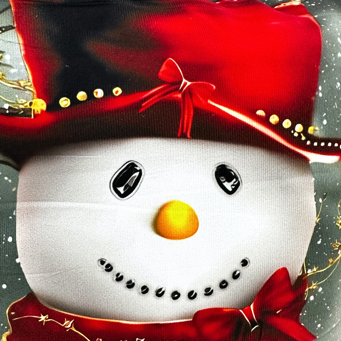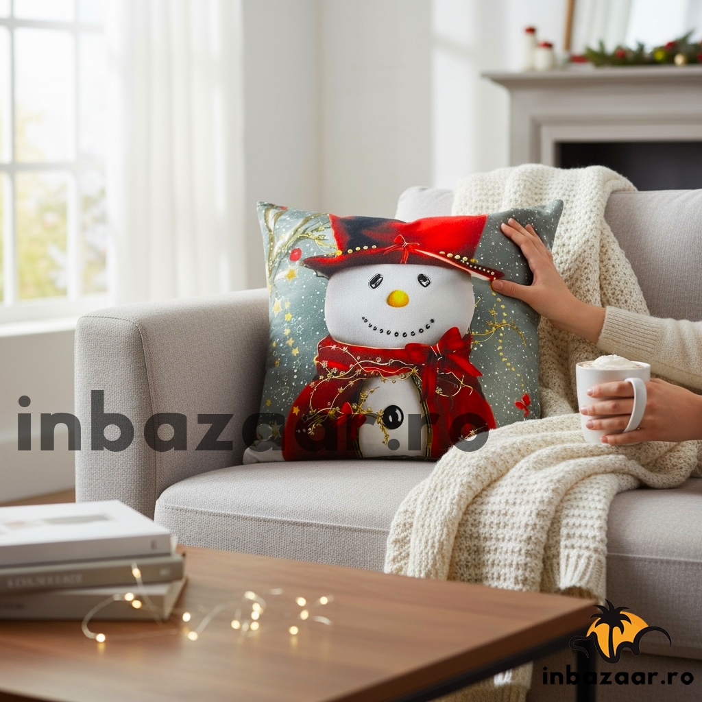 Adu spiritul Crăciunului mai aproape de tine cu această pernă decorativă de Crăciun 40×40 cm, cu un design elegant și vesel ce îl înfățișează pe omul de zăpadă îmbrăcat cu pălărie și fular roșu, înconjurat de stele aurii și sclipiri de sărbătoare.