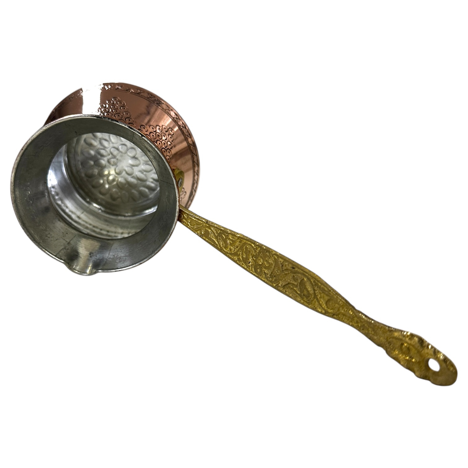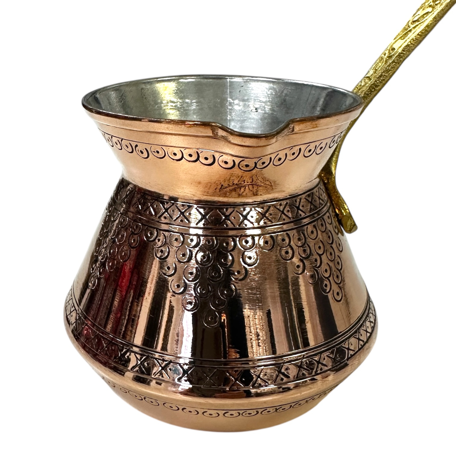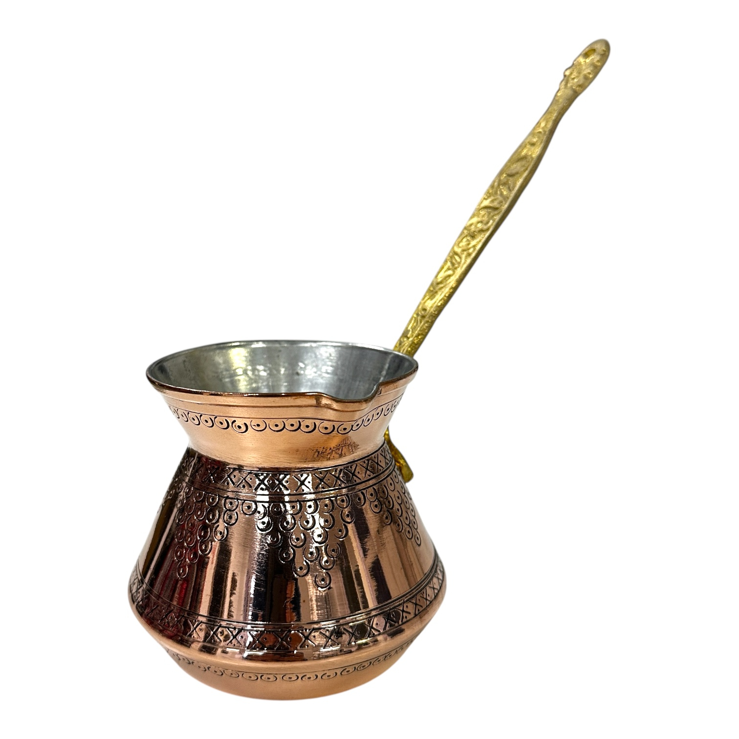 Recomand, merită prețul. Materialul este gros(cupru la exterior, staniu la interior, lemn la mâner). Sistem de prindere a mânerului cu nituri.Aceste caracteristici conferă soliditate. Pe lângă asta, am un obiect de artă grație finisajului.