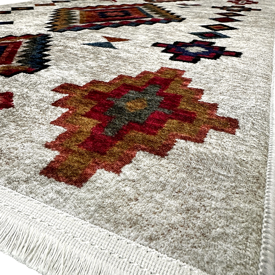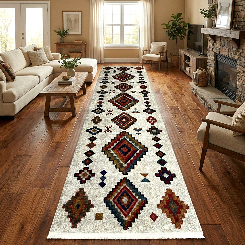 Traversa de 400 cm lungime, disponibilă în două variante de lățime (80 cm și 100 cm), este ideală pentru holuri lungi, coridoare și zone de trecere unde este nevoie atât de protecție, cât și de un accent decorativ elegant. Designul cu motive geometrice inspirate etnic adaugă personalitate spațiului și se integrează armonios în interioare moderne sau clasice.